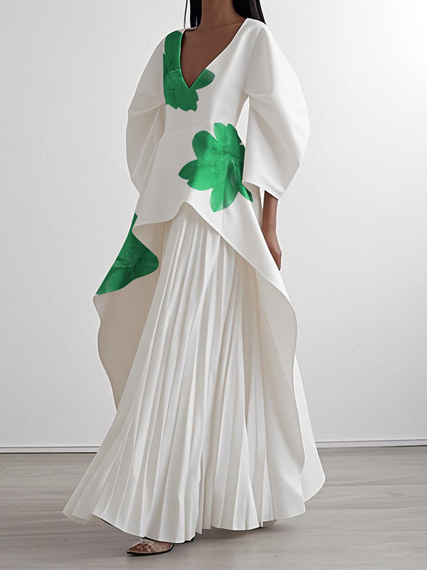 A-Line Loose Flower Print Pleated V-Neck Maxi Dresses