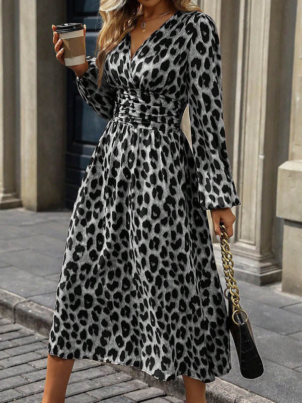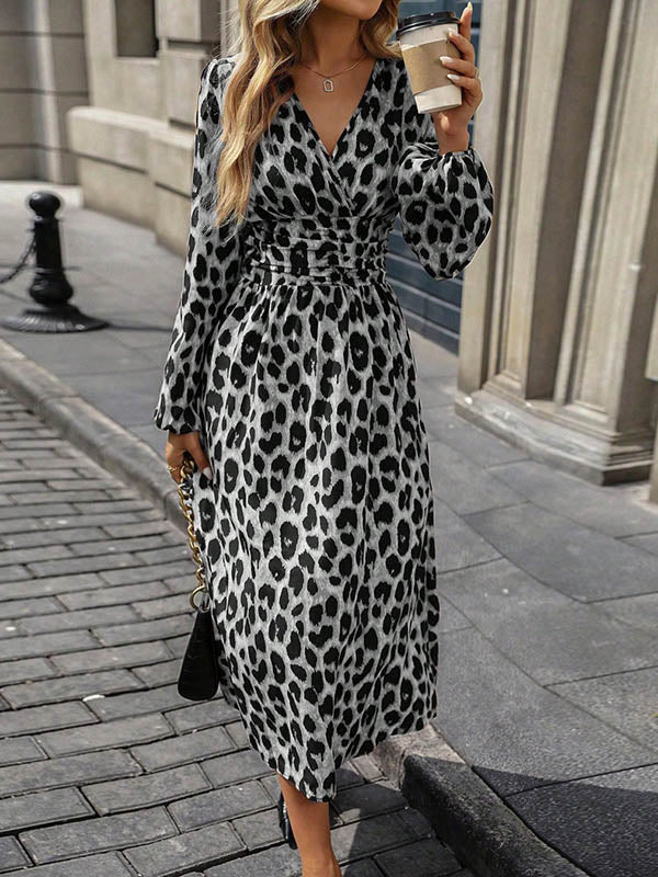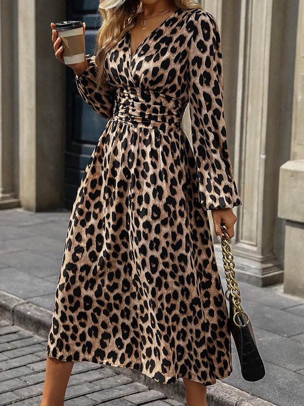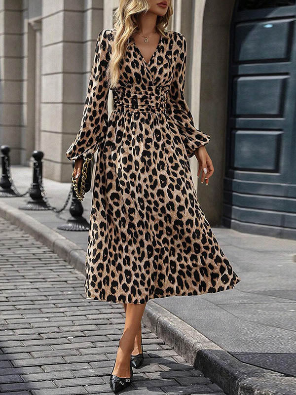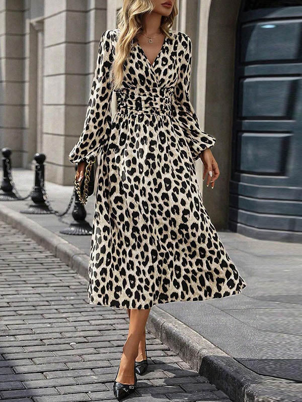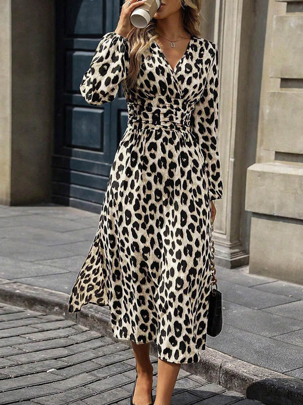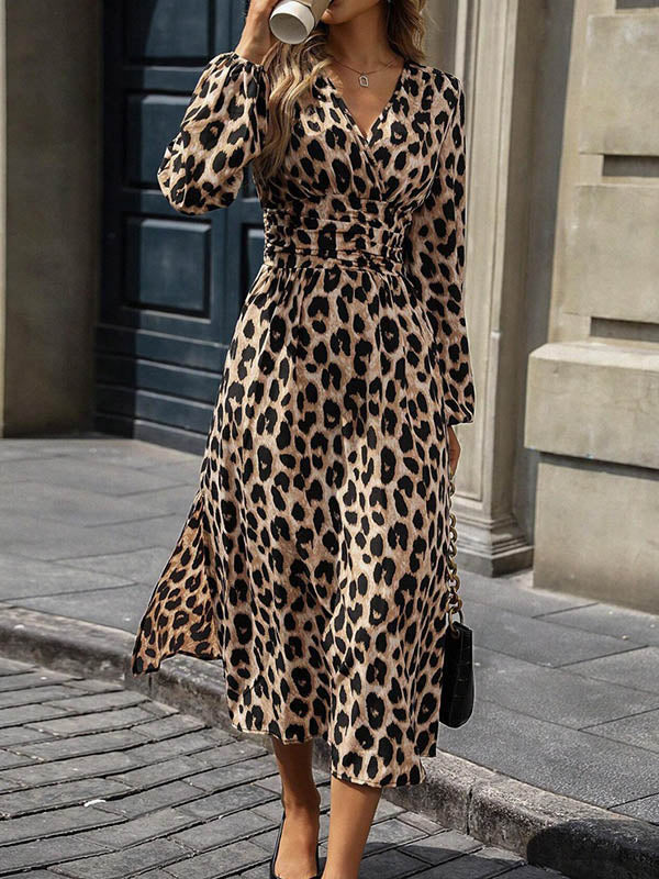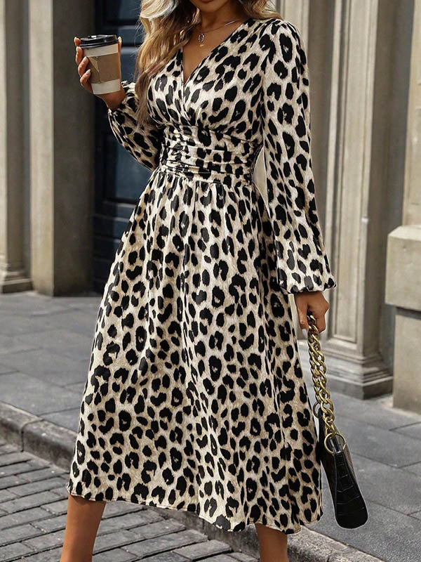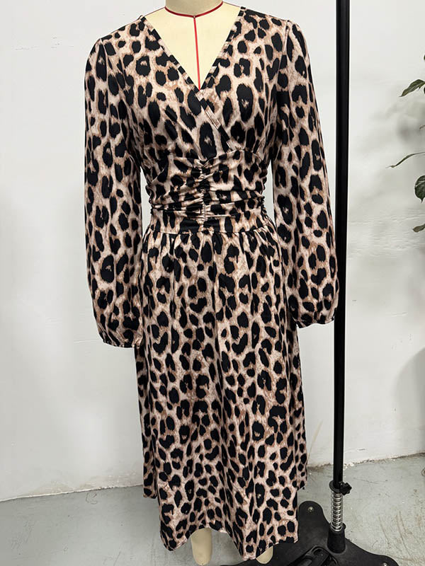 Elasticated Waist High Waisted Contrast Color Leopard Pleated Split-Joint V-Neck Maxi Dresses