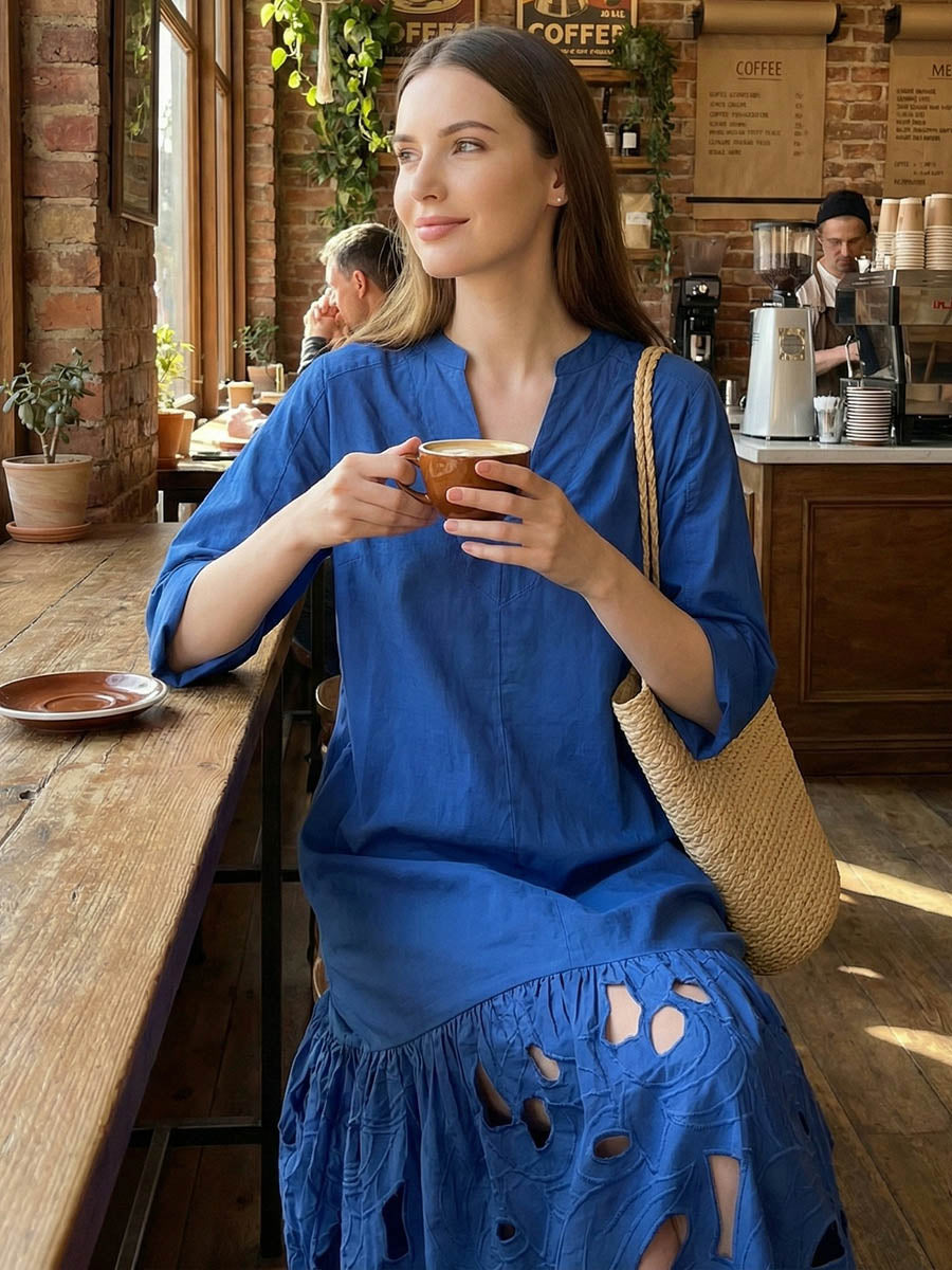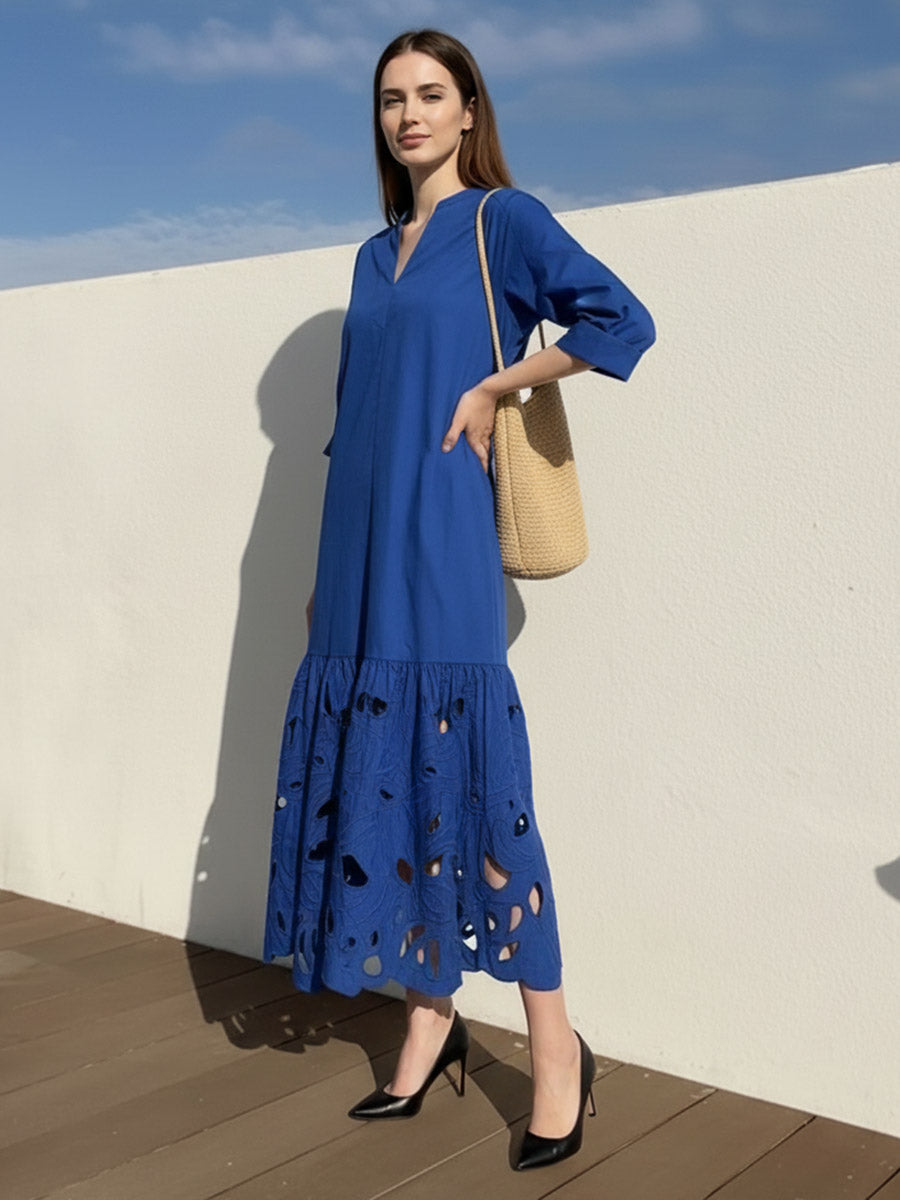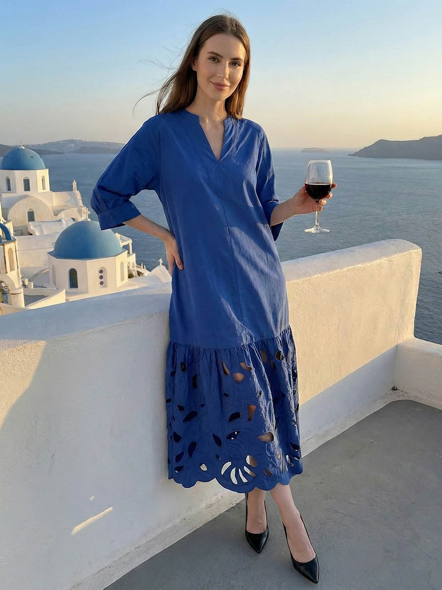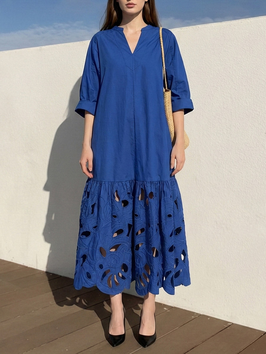A-Line Long Sleeves Hollow Pleated Solid Color Split-Joint V-Neck Maxi Dresses
