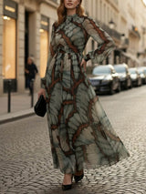 Balloon Sleeves Long Sleeves Big Hemline Contrast Color Pleated Print Zipper Stand Collar Maxi Dresses
