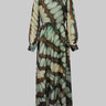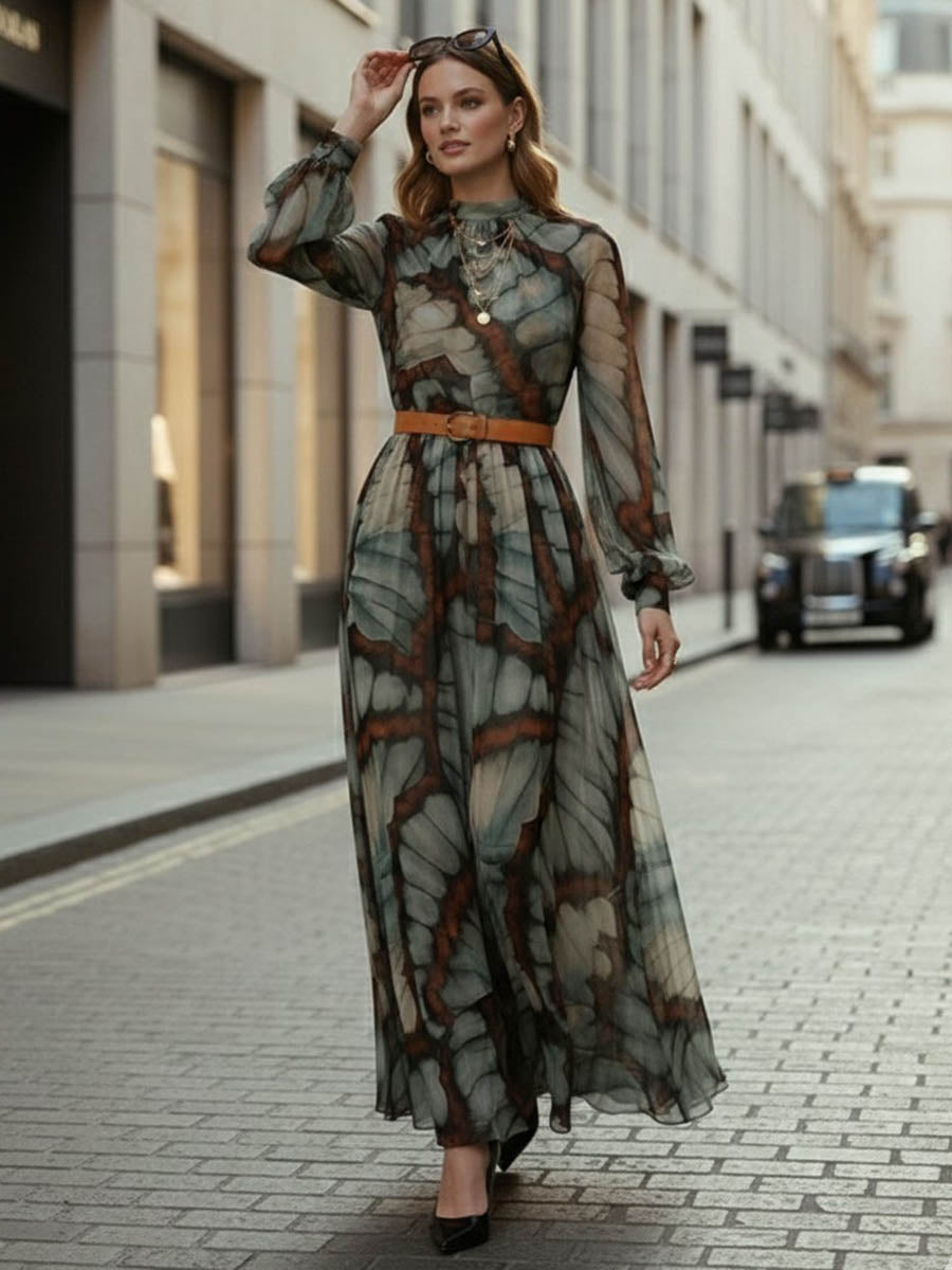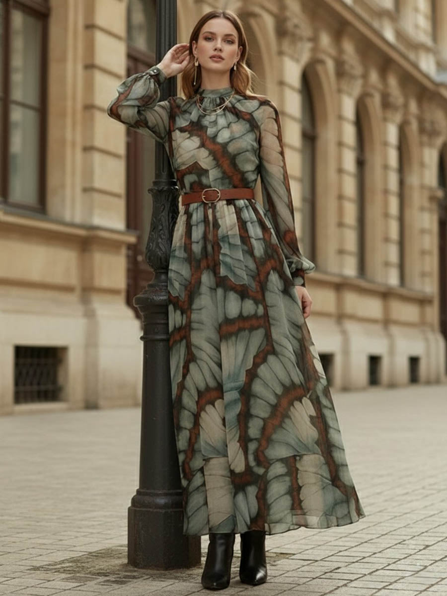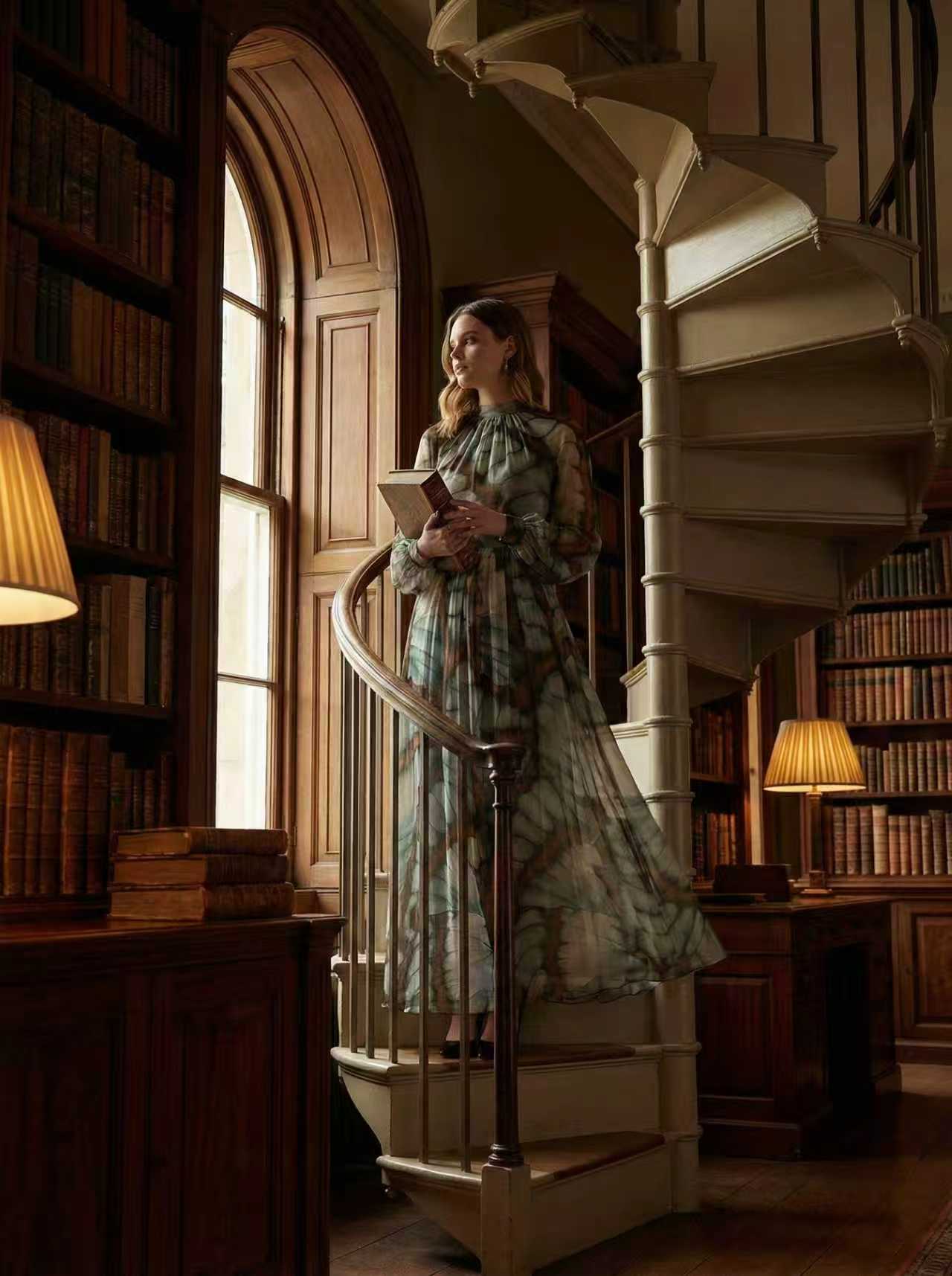 The inspiration for this long dress is "to cut the texture of butterfly wings into wearable natural poems" - we squat in the botanical garden to watch the swallower butterflies rest on the tips of leaves: the veins on the wings are like crumpled watercolors, with a hazy sense of transparency wrapped in grayish green and brownish. So this touch of "natural haziness" was printed on the thin chiffon. The high collar concealed the elegance, the cinched waist highlighted the curves, and when walking, the hem of the skirt swayed like "flowing butterfly wings".