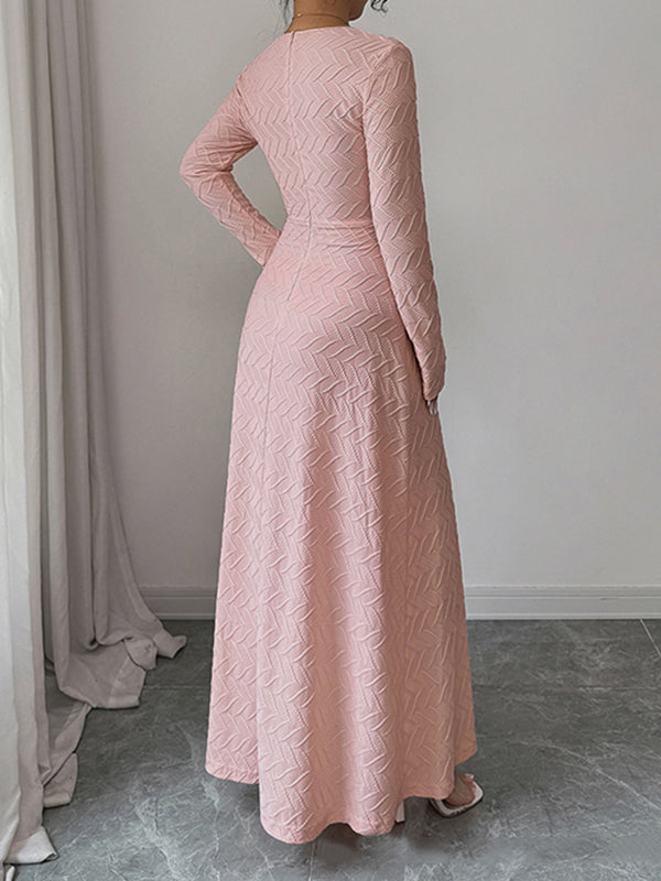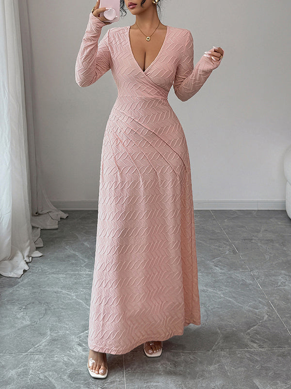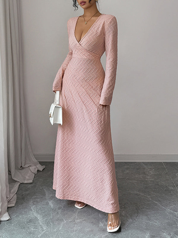 High Waisted Long Sleeves Pleated Solid Color Deep V-Neck Maxi Dresses