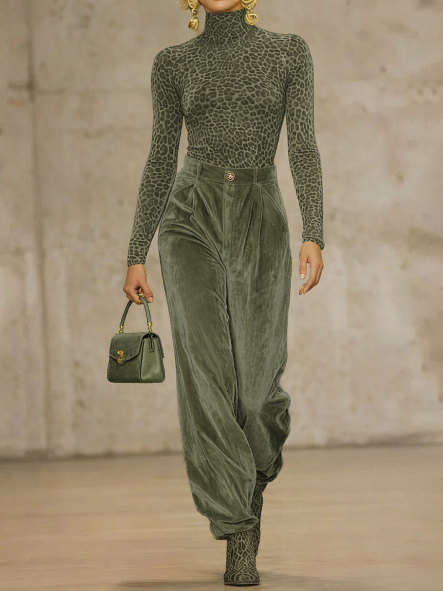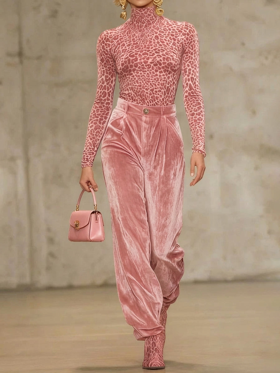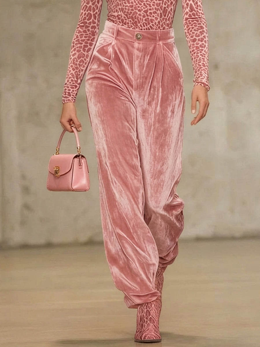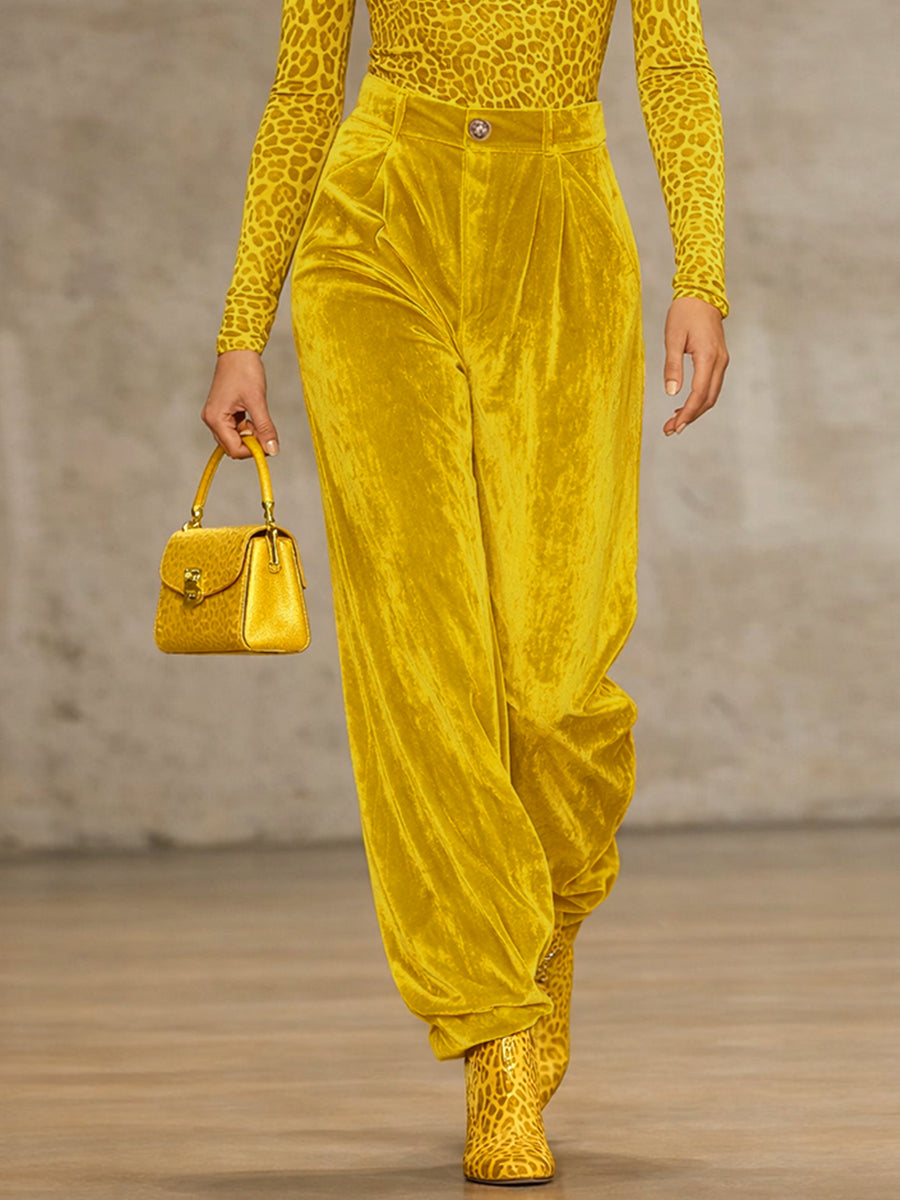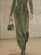 High Waisted Pleated Pockets Solid Color Velvet Pants Trousers