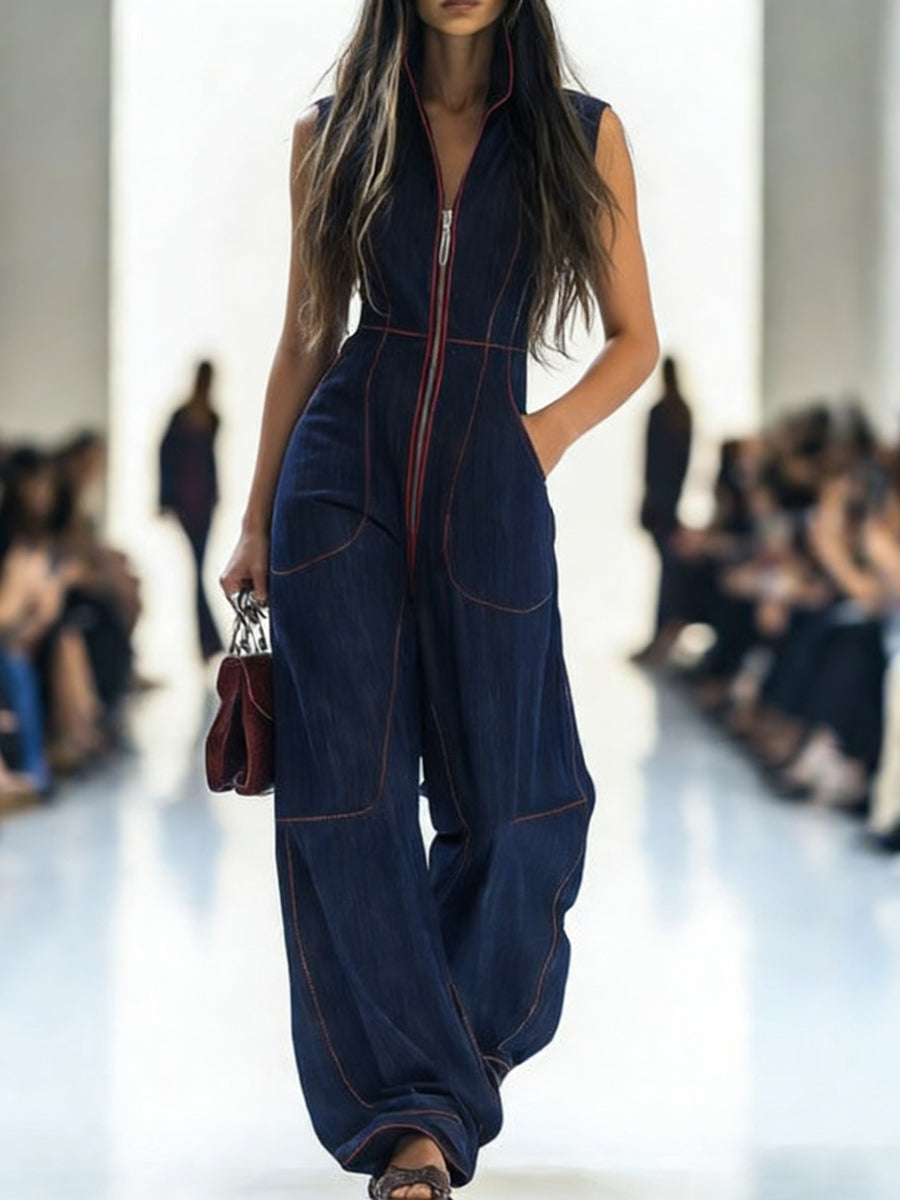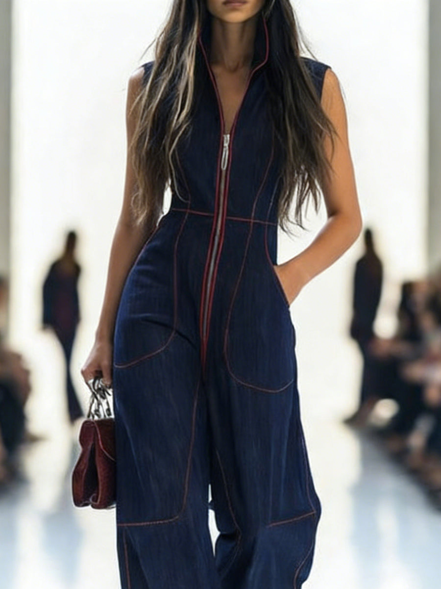 High Waisted Sleeveless Pockets Zipper Stand Collar Jumpsuits