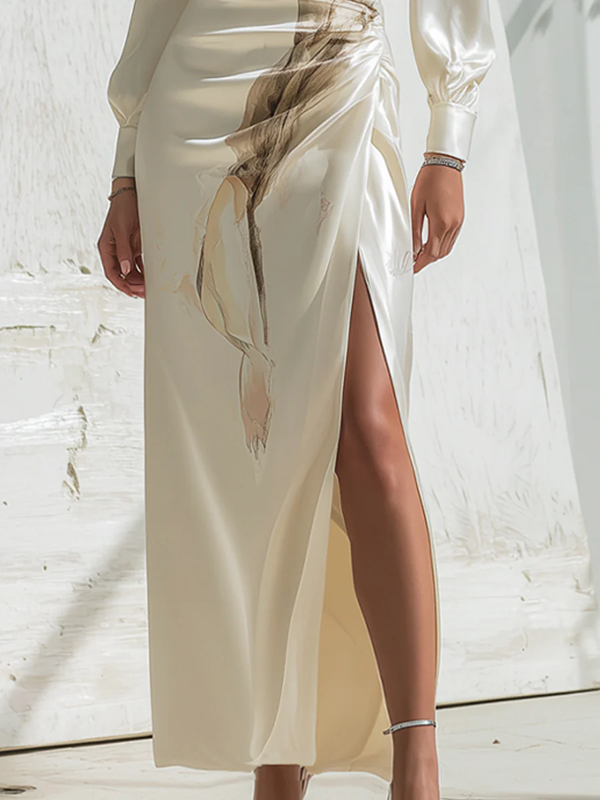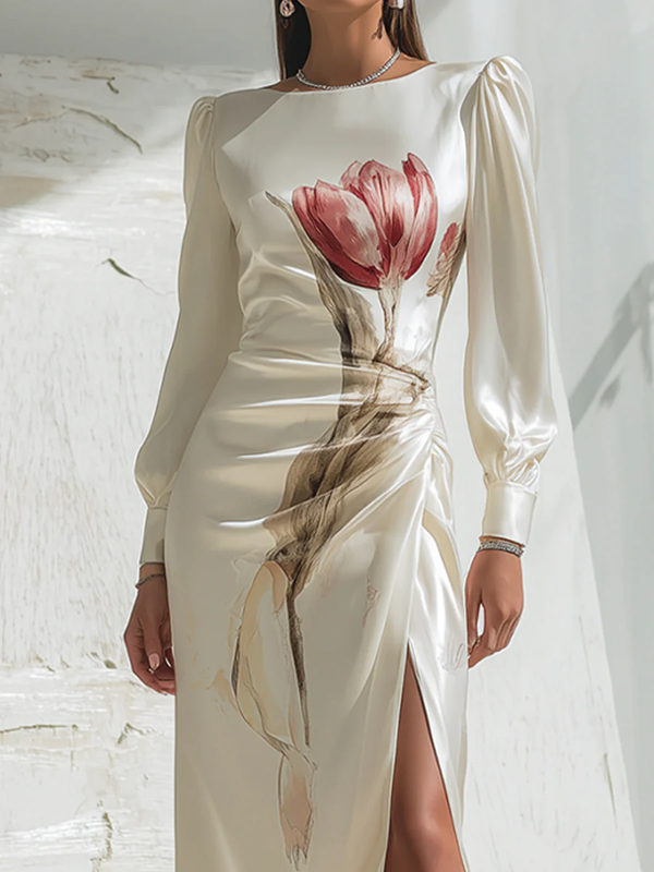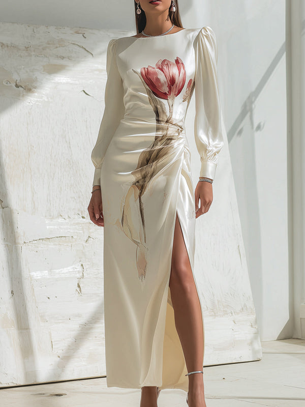 Long Sleeves Flower Print Pleated Split-Side Round-Neck Maxi Dresses