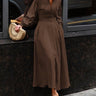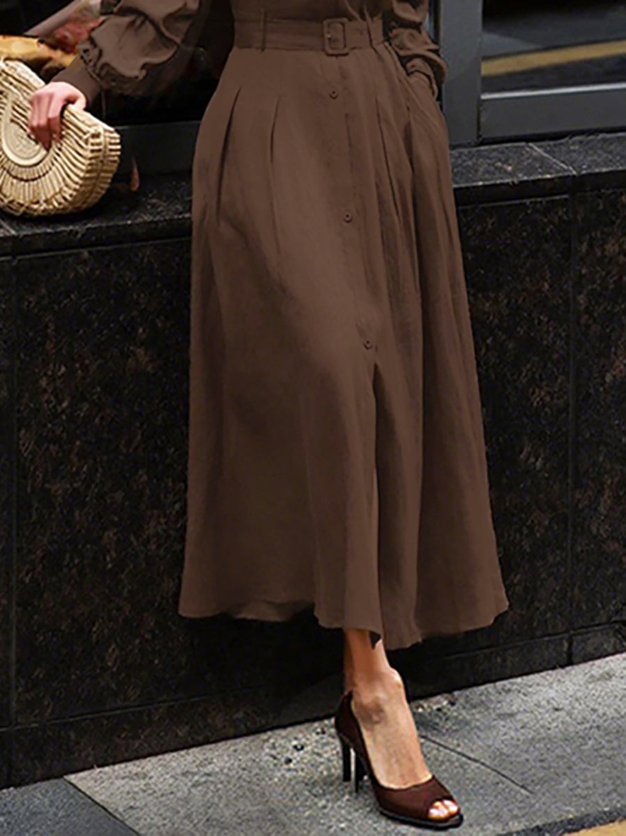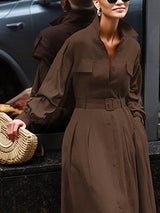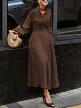 Loose Puff Sleeves Pleated Solid Color Split-Joint Lapel Maxi Dresses Shirt Dress