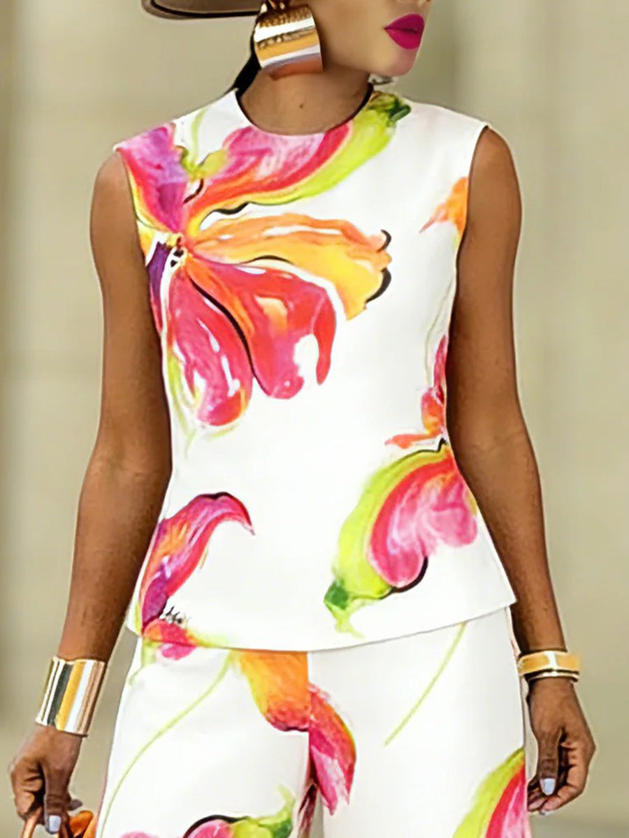Loose Sleeveless Contrast Color Flower Print Round-Neck Tank