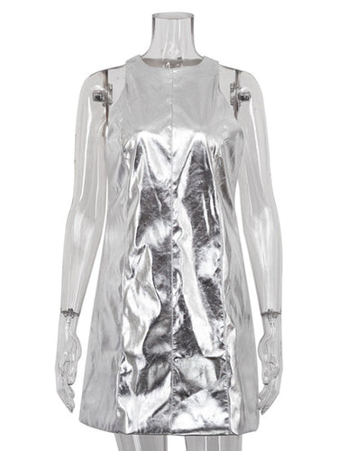 A-line lose glänzende, feste Farbe Reißverschluss rundem Hals Mini-Kleider