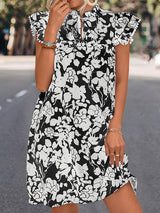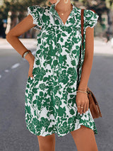 A-Line-Rüschenhülsen bedruckte Split-Gelenk-Mini-Kleider mit V-Ausschnitt