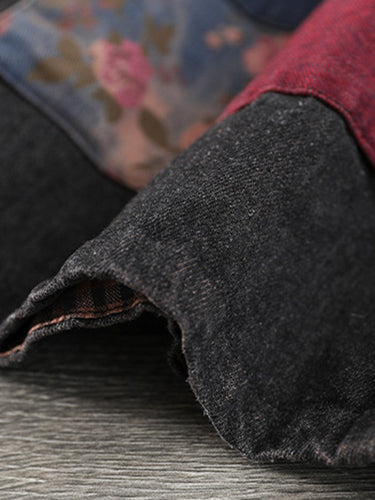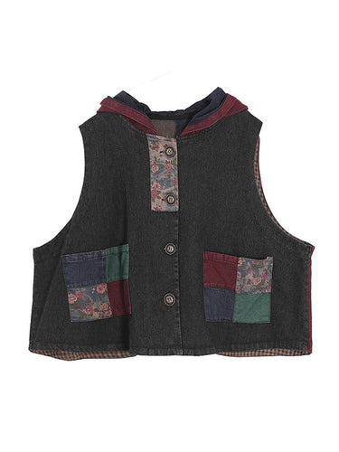 Künstlerische Retro lose Denim ärmelloses geknöpfter Kontrastfarbe Kapuze -Weste Oberbekleidung