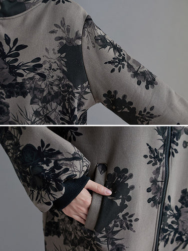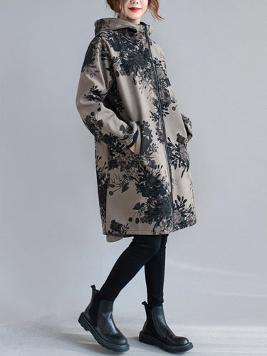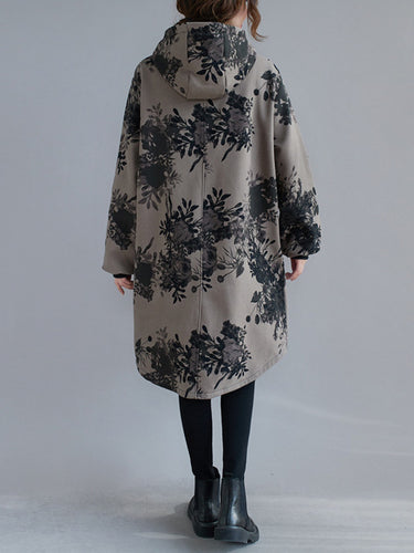 Künstlerischer Retro lose floraldruckgedruckte Kapuze -Langarm -Outwear