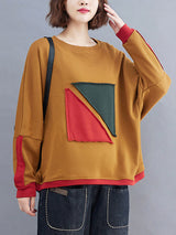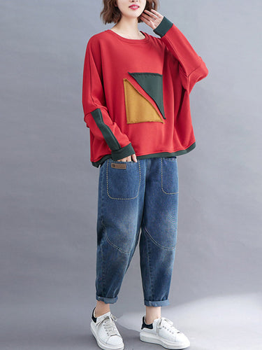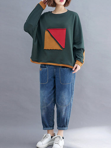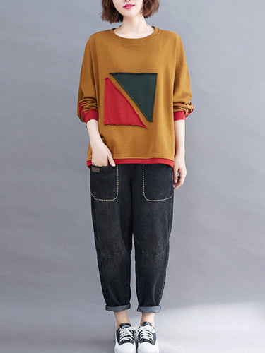 Künstlerische Retro lose Dreieck Applikation Kontrastfarbe rundes Hals Langes Raglan-Ärmel Sweatshirt