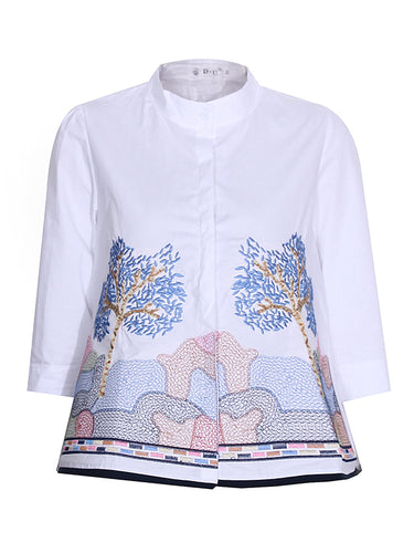 Lässige Dreiviertelhülle lose gestickte Ständer Kragen Blusen und Hemden Tops