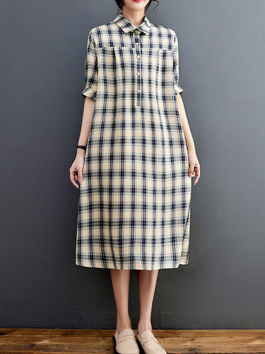 Halbe Ärmel lose karierte Revers Midi -Kleider