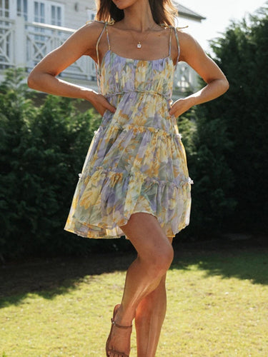 A-line losen Blütendruck geschichtete, mit Spaghetti-Neck-Mini-Kleider mit geteilte Gelenke gebunden