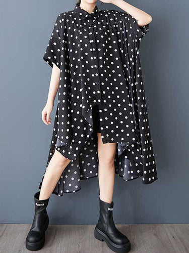 A-Line High-Low Asymmetric Buttoned Polka-Dot-Midi-Kleiderhemdkleid Kleid