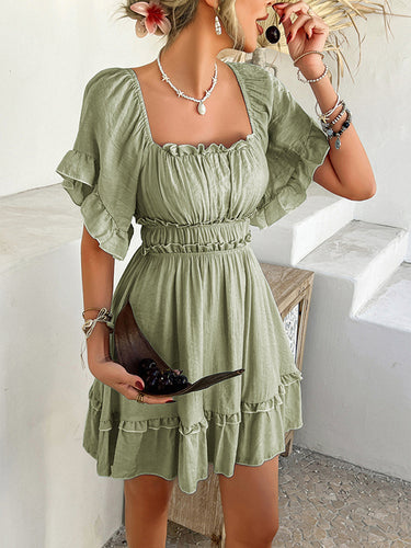 A-Linie hohe taillierte Elastizität Falten Rüschenverkleidung Feste Farben quadratischem Hals Mini-Kleider