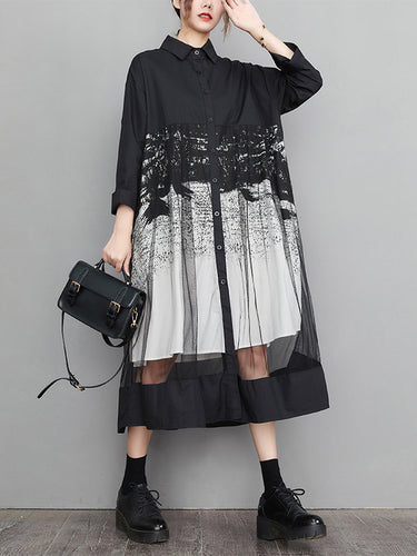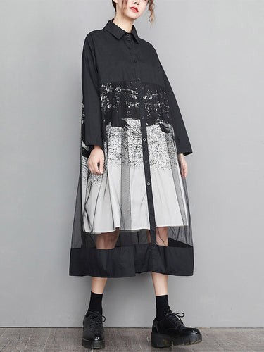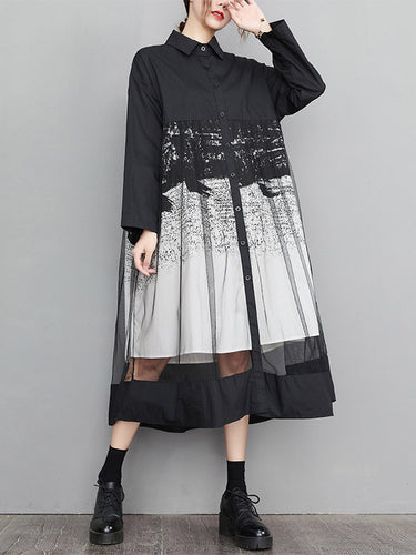 A-Line Langarmes geknöpfte Gaze gedruckte Split-Gelenk-Revers-Midi-Kleider
