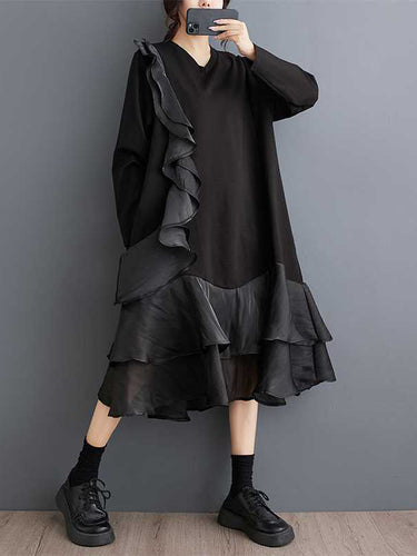 A-Line Langarm-Kontraststaschen Rüschenverkleidung Split-Gelenk V-Ausschnitt Midi-Kleider