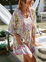 A-line lose buttonte Kontrastfarbe Blumendruck Falten V-Ausschnitt Mini-Kleider