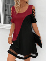 A-line lose Kontrastfarbe hohles Mesh Split-Gelenk kalte Schulter-Mini-Kleider