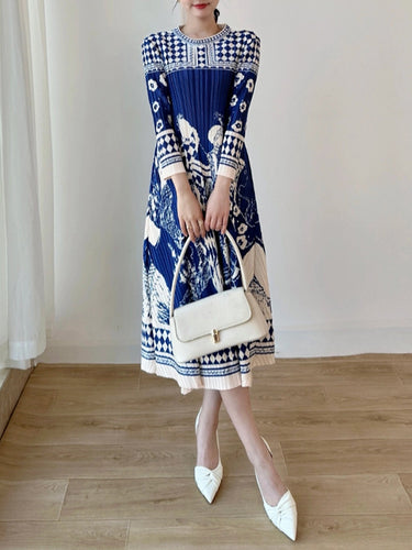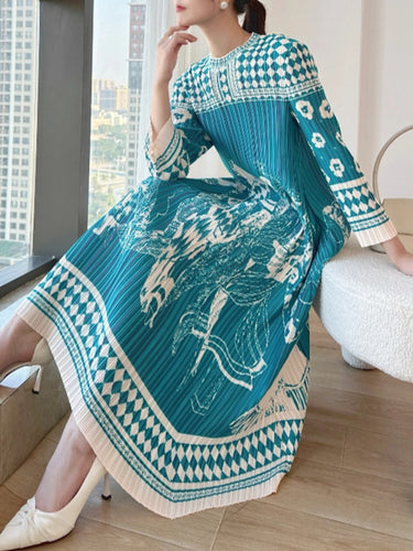 A-line lose plissierte gedruckte Runde-Hals-Midi-Kleider