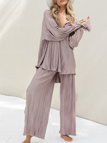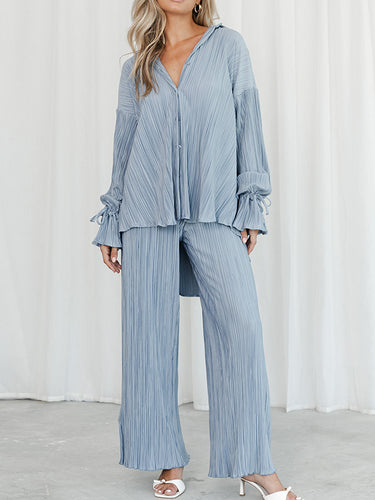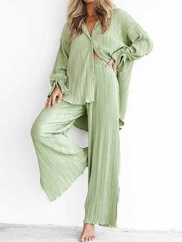 Ausgeflügelte Ärmeln lange Ärmel geknöpfte Kordelzug plissierte fehlende Farbfarbe Split-Side-Revers-Hemden Top + Hosen Bottom Pyjama Sets