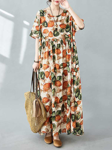 Halbe Ärmel lose, plissierte gedruckte Split-Gelenk-Midi-Kleider mit rundem Hals