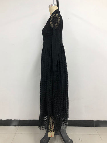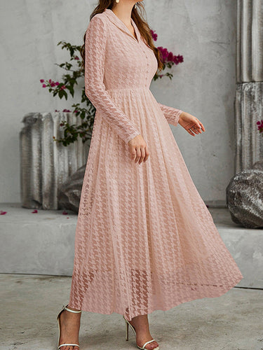 Hohe taillierte langhärme geknöpfte Gaze-Durchsicht durch massive Farbe V-Ausschnitt Maxi-Kleider