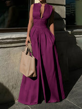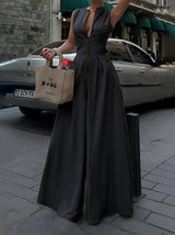 Hohe taillierte lose Taschen Feste Farbe Reißverschluss V-Ausschnitt-Overalls