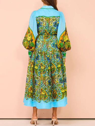 Hohe taillierte lose Puffärmel mit blumig gedrucktem Lappel -Midi -Kleider