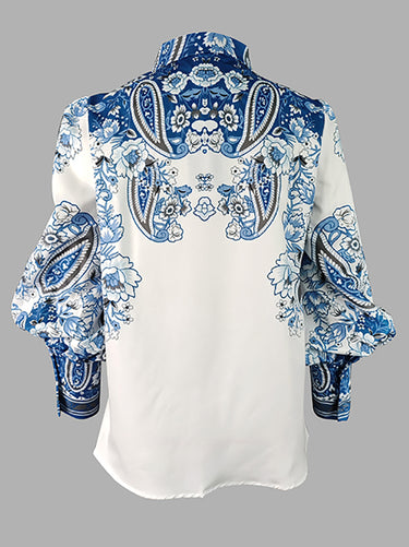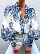 Lange Ärmeln lose geknöpfte Blumendrucks V-Hals Blusen und Hemden Tops
