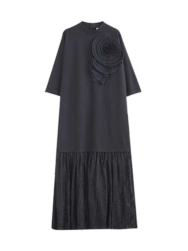 Lange Ärmeln lose farbige Farbgeschwindigkeit dreidimensionale Blume Mock Hals Maxi Kleider