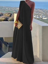 Lose asymmetrische Festfarb-Split-Schulter-Maxi-Kleider mit One-Shoulder