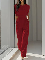 Lose, plissierte, fehlende Farbfarb-Split-Gelenk-Overalls mit rundem Hals