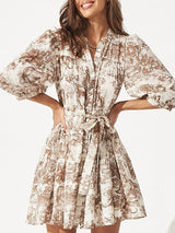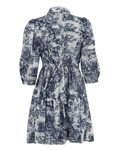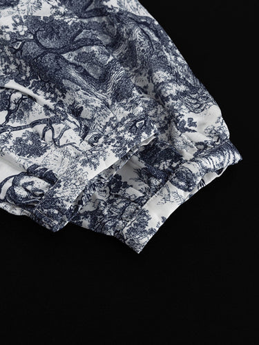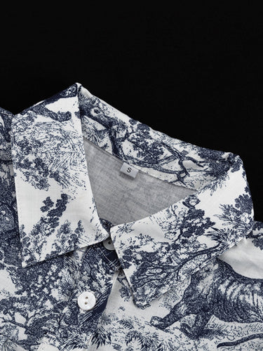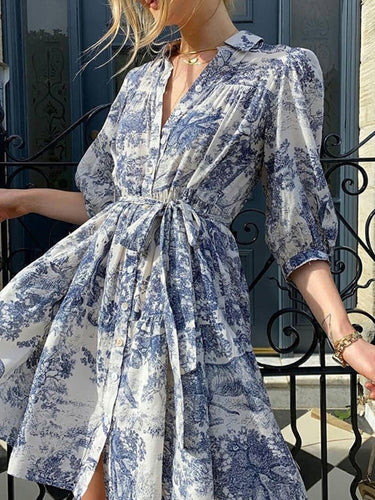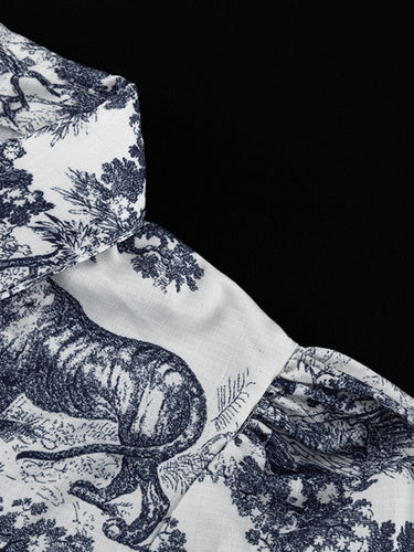 Lose Puffärmele plissierte gedruckte Split-Gelenk-Taille-Lappel-Mini-Kleiderhemdkleid
