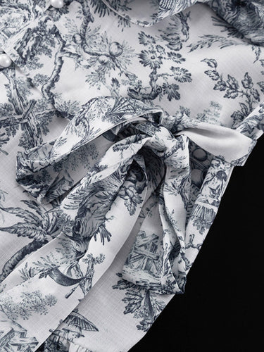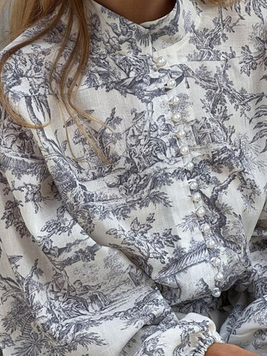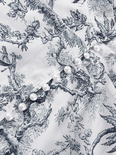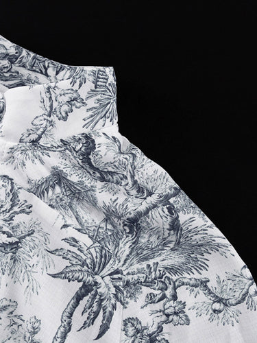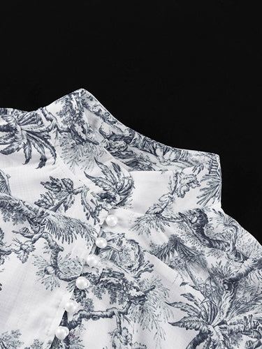 Lose Puffärmele plissierte gedruckte Split-Gelenk-Taillenstillstandskragen Mini-Kleider