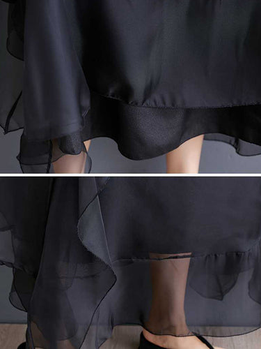 Lose Rüschenhülsen Falbala zerzaust Feste Farbfarbe Rund-Hals Midi Kleider