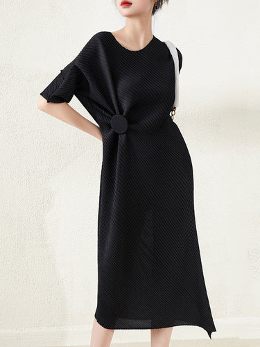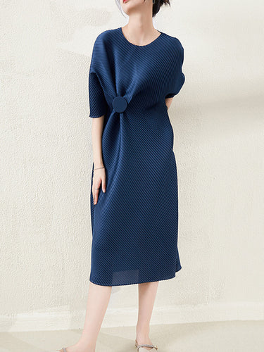 Stilvolle Unregelmäßigkeit lose plissierte Feste Farbfarbe mit rundem Hals Midi-Kleidern