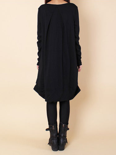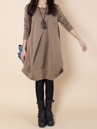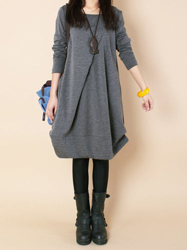A-Line Langarmes plissierte Feste Farbkleider mit rundem Hals Maxikleider