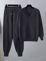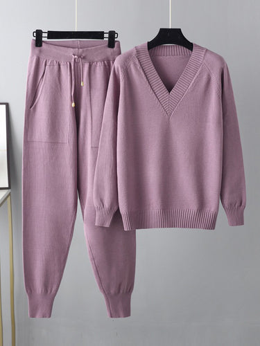 Lässige losen Haremhose Feste Farbe V-Ausschnitt Pullover Tops Hose Zwei Stücke Set Set