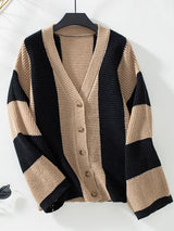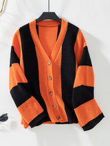 Lange Ärmeln lose geknöpfte Kontrastfarbe Split-Gelenk gestreiftes V-Ausschnitt-Strickjacken mit V-Aus-Tops
