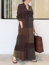 Lange Ärmeln lose karierte Taschen Lupe Maxi Kleider Hemdkleid Kleid