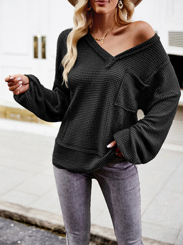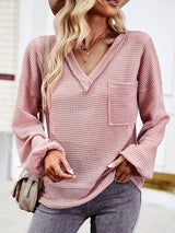 Lange Ärmeln lose Elastizitätstaschen Feste Farben Split-Gelenk V-Ausschnitt T-Shirts Tops