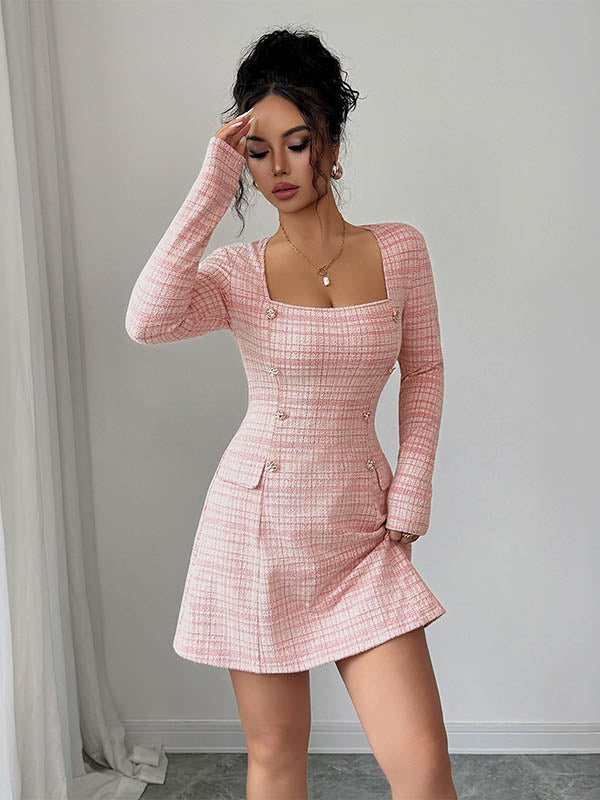A-Linien-Minikleider mit hohem Bund, Knöpfen, kontrastfarbenem Karomuster und eckigem Ausschnitt