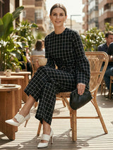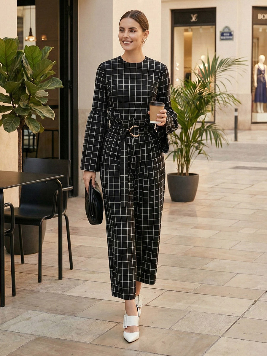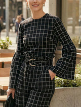 Blusen und Hemden mit ausgestellten Ärmeln, langen Ärmeln, kontrastfarbenem Karomuster, Rundhalsausschnitt und geteilter Naht