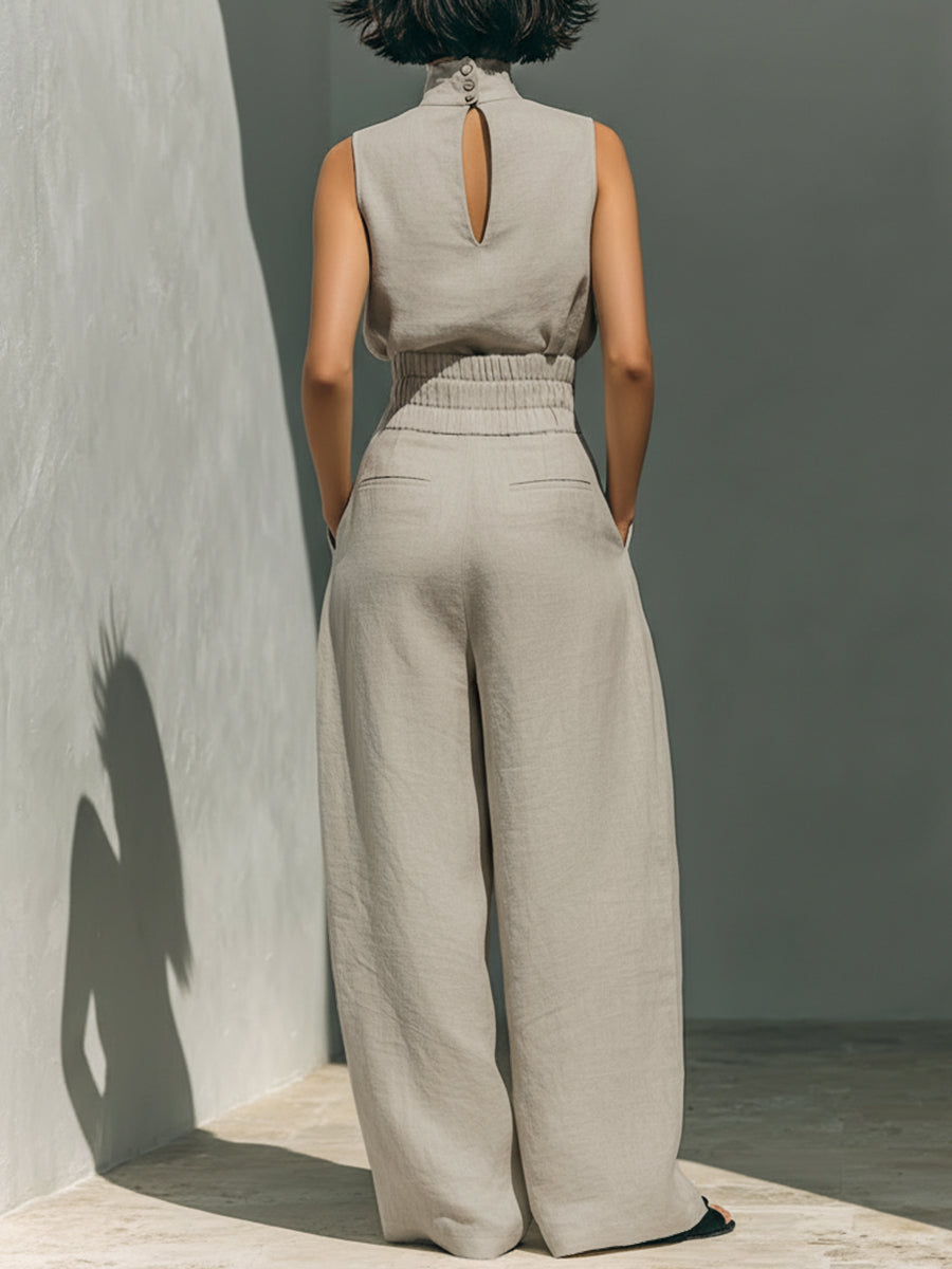 High Waisted Wide Leg Elasticity Pleated Pockets Solid Color Split-Joint Pants Trousers