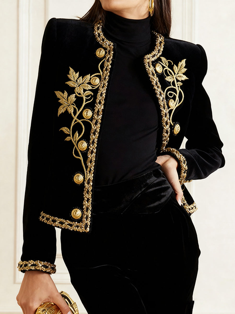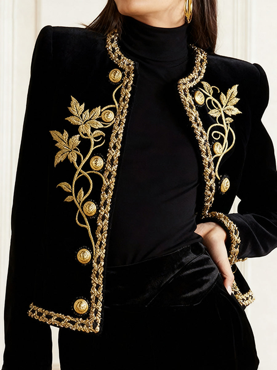 Long Sleeves Buttoned Embroidered Round-Neck Jackets Outerwear