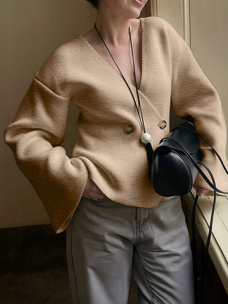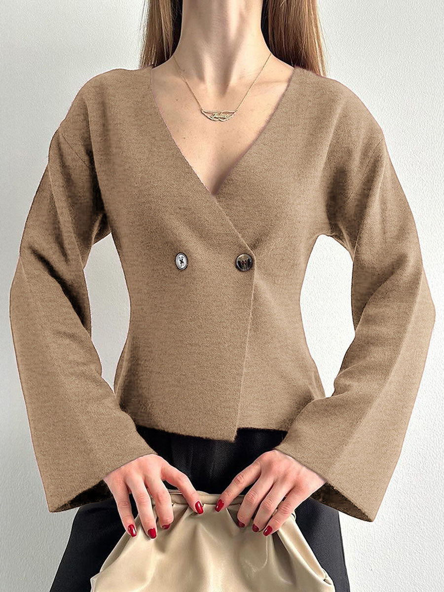 Long Sleeves Buttoned Solid Color V-Neck Cardigan Tops