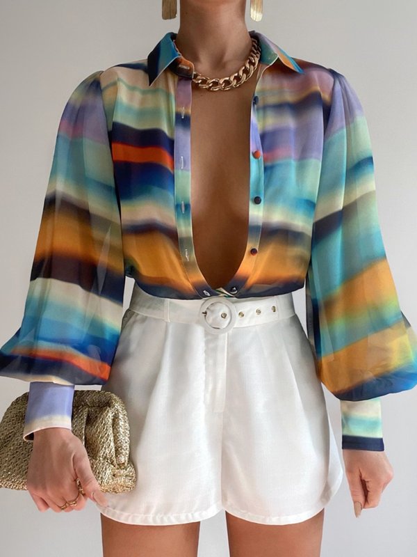 Long Sleeves Loose Buttoned Contrast Color Lapel Blouses&Shirts Tops
